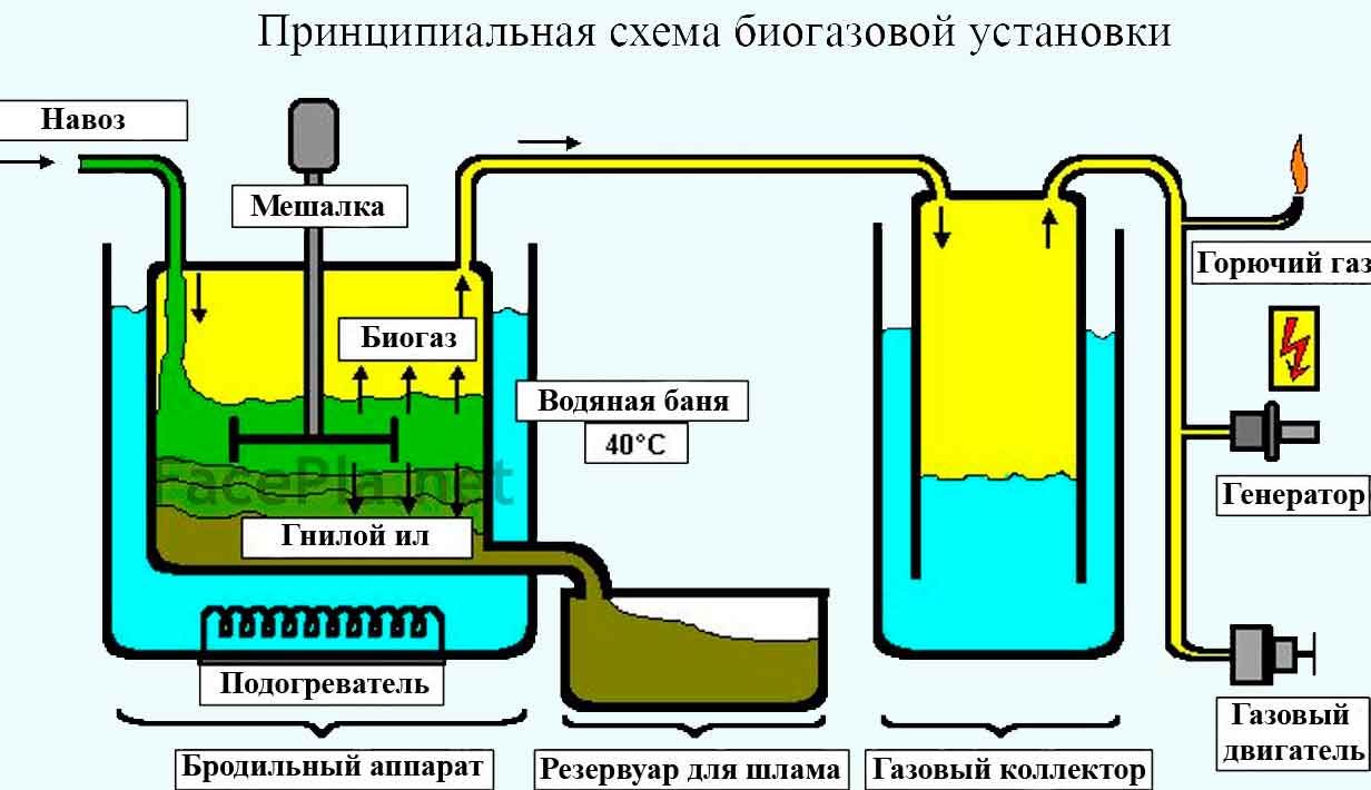 Образовавшиеся газы поднимаются кверху емкости, откуда их затем выкачивают, а вниз оседает остаточный продукт – высококачественное органическое удобрение, сохранившее в результате обработки все ценные вещества, имеющиеся в навозе – азот и фосфор, и потерявшее значительную часть патогенных микроорганизмов.