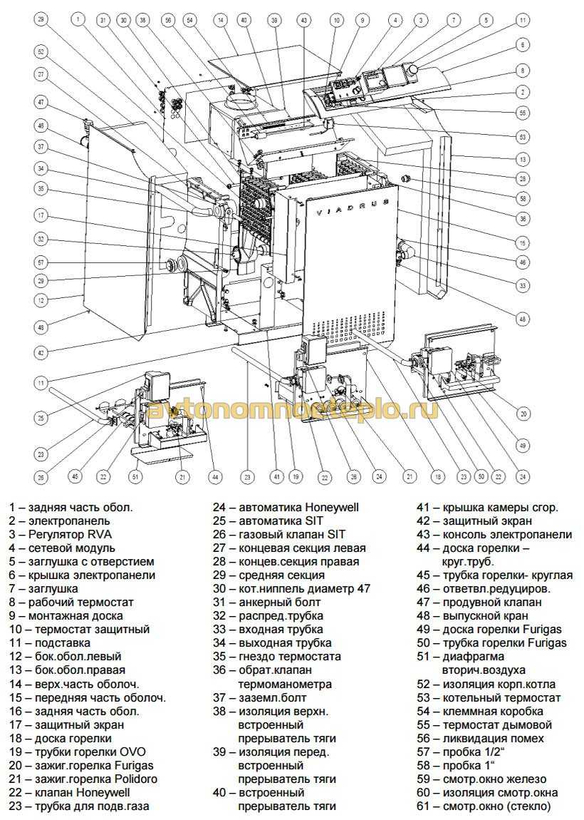 Энергонезависимые бытовые напольные газовые котлы Viadrus имеют простую конструкцию, направленную на достижение максимальной производительности и увеличение срока эксплуатации. В базовую комплектацию входит: