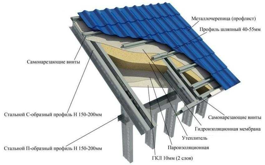 Элементами стальной конструкции крыши являются несущие фермы, стропильные элементы и пролетные перекрытия. Сами работы ничем не отличаются от возведения крыши из других материалов. Сначала строят стропильную систему и делают обрешетку кровли. Затем выполняют паро-, гидроизоляцию и укладывают финишное покрытие кровли.