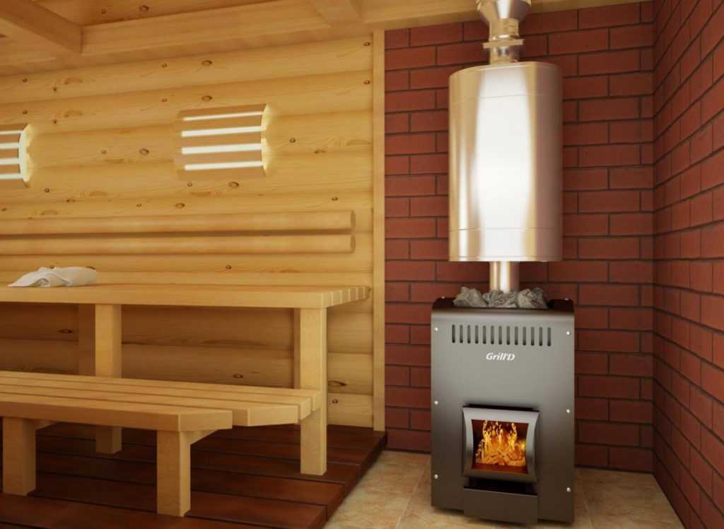 В стандартных дровяных моделях дымоход проходит непосредственно через каменку. Стоит отметить, что в продаже предусмотрены печи с навесным баком для нагревания воды. Его навязывают на боковой части или устанавливают на дымоходную трубу.