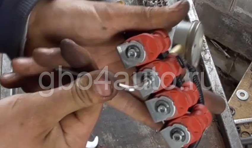 Данные форсунки можно встретить в виде планок по 3 либо 4 форсунки. Сменные жиклеры подбираются под необходимый диаметр, что обеспечивает широкий спектр применения на двигателях разной мощности. Эти форсунки поддерживаются програмным обеспечением почти всех блоков управления ГБО. Шток в данных форсунках металический с резиновым наконечником, который собственно и перекрывает выход газа. Интересный факт втом, что над катушками распологаются винты для регулировки высоты поднятия штока форсунки, а сами катушки крепятся фиксаторами, так вот, предназначение данных винтов люди часто путают и закручивают их, думая что тем самым лучше фиксируют катушку. В итоге газ либо вообще не поступает, либо поступает неравномерно в цилиндры двигателя, что сказывается на неблагоприятной работе газовой системы в целом.