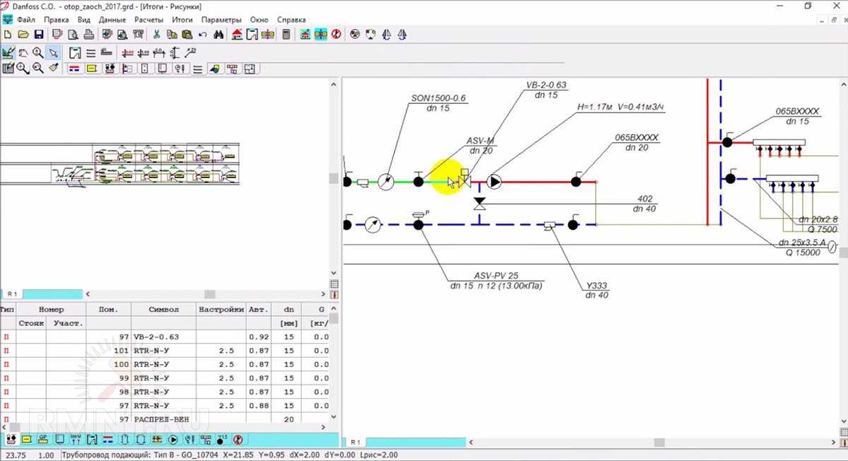 На сегодняшний день существует достаточно большое количество программного обеспечения, предоставляемого крупнейшими производителями отопительной техники, такими как Valtec, Danfoss или Herz. В подобных программных комплексах для расчёта поведения гидравлики используется та же методология, которая была описана в нашем обзоре. Сначала в визуальном редакторе моделируется точная копия проектируемой системы отопления, для которой указываются данные о тепловой мощности, типе теплоносителя, протяжённости и высоте перепадов трубопроводов, используемой арматуре, радиаторах и змеевиках тёплого пола. В библиотеке программы имеется широкий спектр гидротехнических устройств и арматуры, для каждого изделия производитель заблаговременно определил рабочие параметры и базовые коэффициенты. При желании можно добавить и сторонние образцы устройств, если для них известен требуемый перечень характеристик.