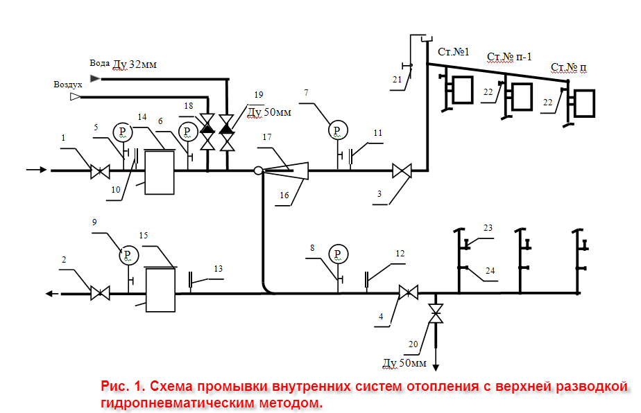 - Начиная с дальнего стояка, осуществляется гидропневматическая промывка последовательно всех стояков.