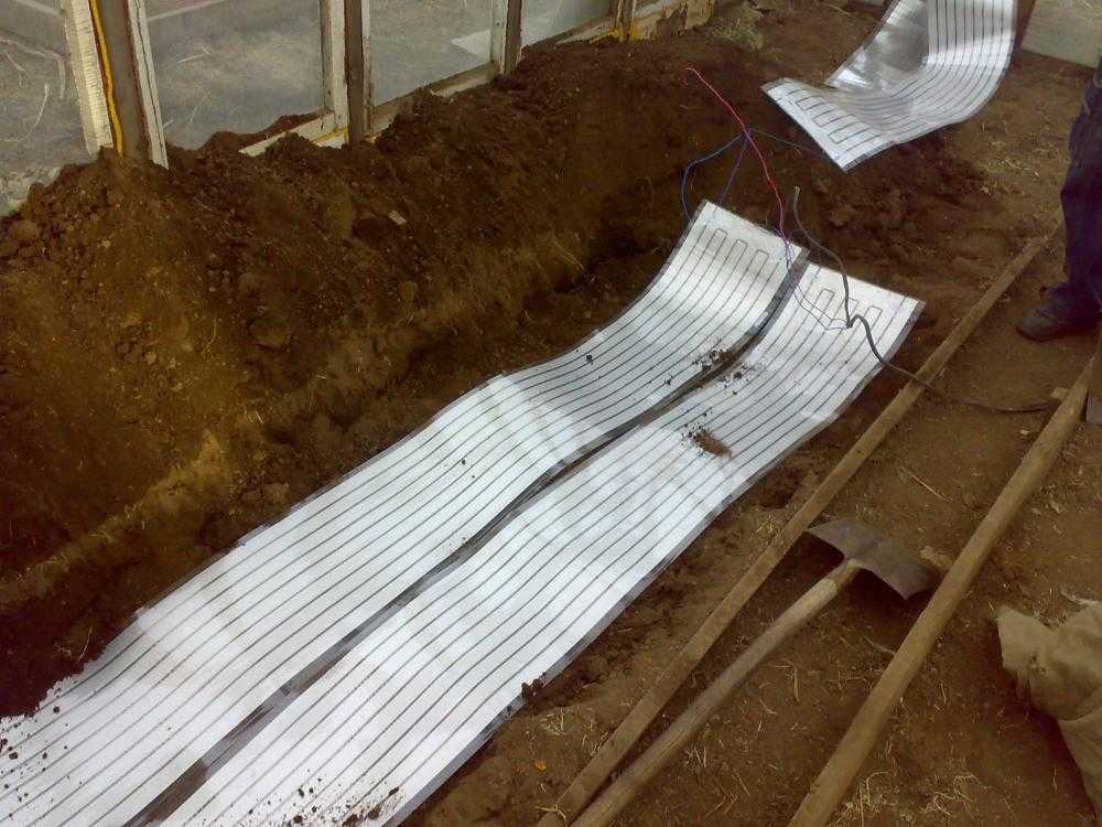 Слой почвы снимается на глубину до 50 см. После снятия плодородного слоя почву утрамбовывают и укладывают теплоизоляционный слой, который делают из жесткого пенопласта или пенополистирольных плит толщиной около 10 см, затем идет слой гидроизоляции, для которого можно использовать обычную полиэтиленовую пленку. Следующий слой формируется песком высотой не менее 5 см, по песчаному слою укладываются подготовленные трубы или электрические нагревательные элементы, выводя наружу патрубки.