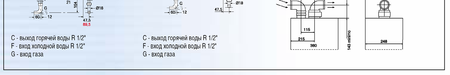 Патрубки подачи холодной воды, газа, отвода горячей воды и теплоносителя отопительной системы расположены на нижней панели корпуса прибора.