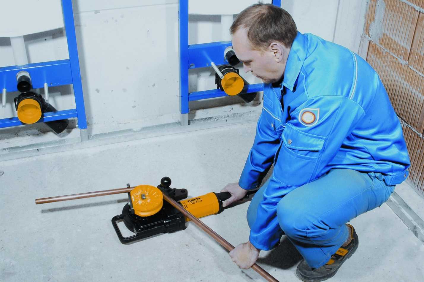 - Использование трубогиба. Инструмент позволяет согнуть трубу под необходимым углом, исключая возникновение брака. Высокая стоимость трубогиба не оправдывает его единичного использования. Рекомендуется приобретать для проведения постоянных масштабных работ.