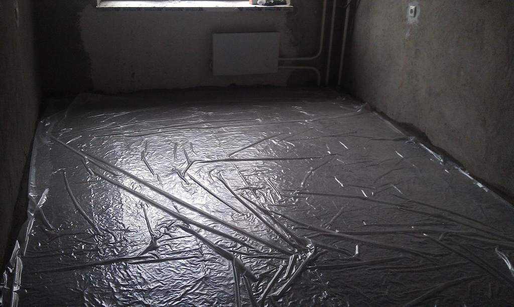 Гидроизолирующий слой может состоять из полиэтиленовой пленки, которая должна находить на стены на 15-20 см, или нанесенного на полы и нижние части стен специальной водоотталкивающей грунтовки глубокого проникновения.