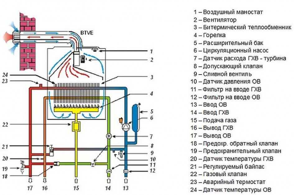 Внутри емкости с отопительной водой (ОВ, или теплоносителем) имеется медный змеевик, по которому пропускается вода из отдельной линии подпитки.