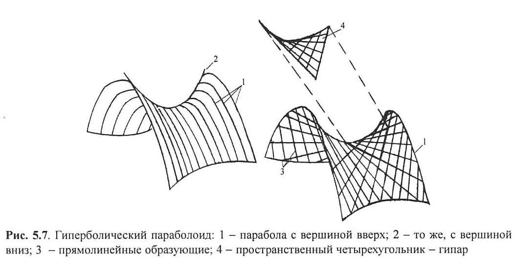 Рис. 5.7. Гиперболический параболоидОболочки являются пространственными конструкциями как по форме, так и по существу статической работы. Их большая по сравнению с плоскостными конструкциями несущая способность определяется не дополнительным расходом материалов, а только изменением формы конструкции, способствующей повышению ее жесткости.