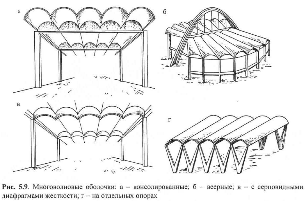 Рис. 5.9. Многоволновые оболочкиЦилиндрические и коноидальные своды-оболочки используются по большей части в многоволновых одно- и многопролетных сочетаниях; применяют консольные и бесконсольные, параллельные и веерные оболочки, разнообразные формы жесткостных элементов (рис. 5.9).