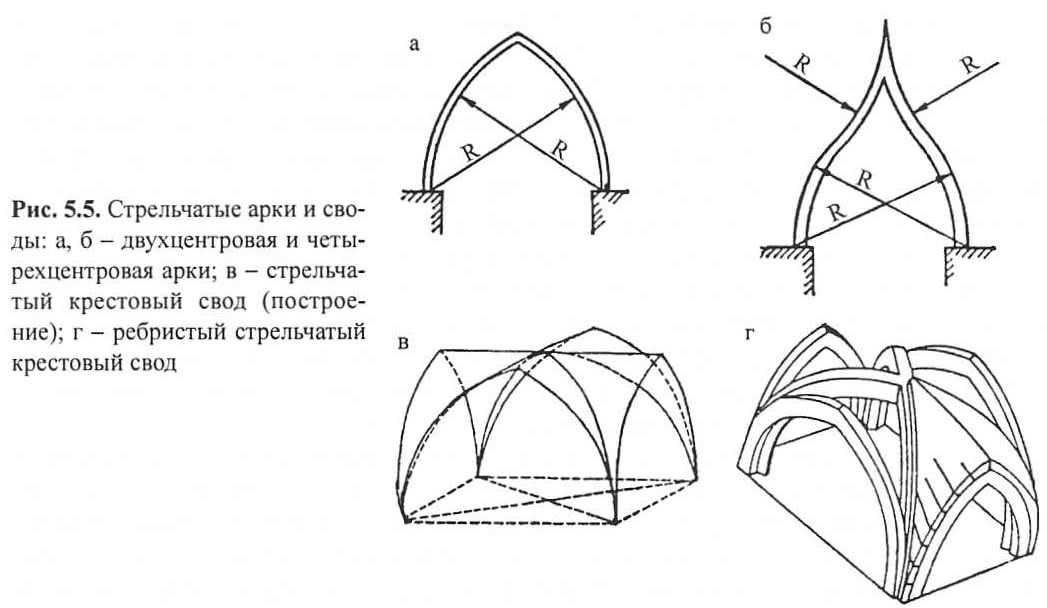 Рис. 5.5. Стрельчатые арки и сводыКонструкции сводов совмещают несущие и ограждающие функции. Применение арочных несущих конструкций требует дополнения их специальными ограждениями. Разнообразные модификации цилиндрических арок и сводов были разработаны и широко применялись в эпоху Древнего Рима (I в. до н.э. — IV в. н.э.). Возводились эти конструкции из кирпича, тесаного камня и бетона. Дальнейшее развитие каменные сводчатые конструкции получили в эпоху романики и готики (XI — XV вв.) на базе цилиндрических, а затем более сложных по форме стрельчатых сводов (рис. 5.5), возникших в зодчестве Арабского халифата (VII — IX вв. н.э.) и занесенных в Европу в эпоху крестовых походов,