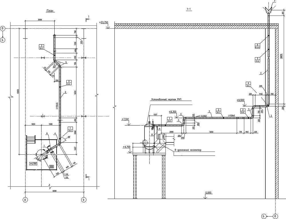 На другом чертеже показан выхлопной трубопровода от предохранительного клапана РНП. Трубопровод от предохранительного клапана направляется к краю главного корпуса и в створе колонн уводится на крышу, на высоту более 2х метров, чтобы обеспечить безопасность персоналу станции. На выхлопном трубопроводе предусматривается гидрозатвор, для удаления дренажа в дренажный коллектор. Из опыта эксплуатации диаметр трубы гидрозатвора рекомендуется делать больше, чем обычного дренажа, для препятствия его засорения, так как в выхлопной трубопровод из атмосферы могут попадать листья и другая грязь.