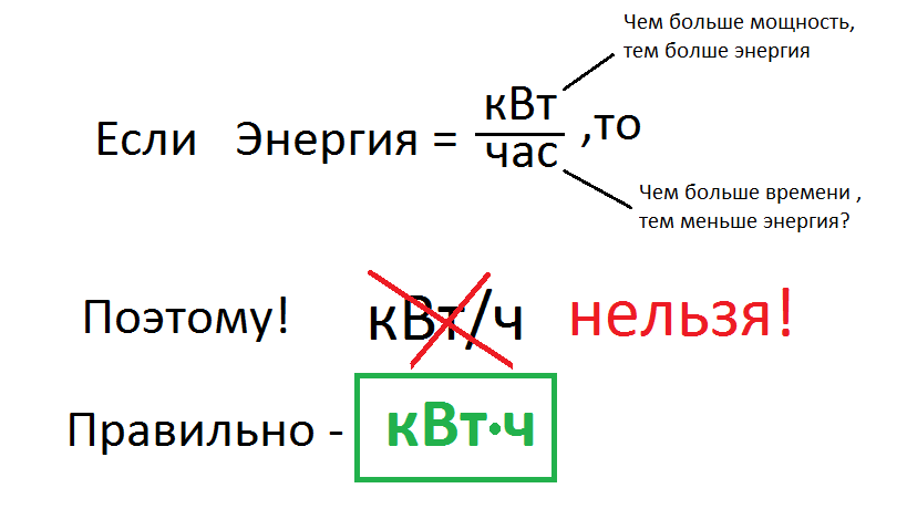 Определение ответа на вопрос дано на картинке запроса из Гугла, но я немного разверну его. Тут надо малость вспомнить математику и дроби. Если мы ошибочно сделаем запись о потребленной энергии в виде 100 кВт/ч, то это будет означать, что чем больше у нас киловатт мощности имеет нагрузка (чайник, утюг), то энергии потребляться будет больше (киловатты в числителе). А вот чем больше часов ваш чайник в N киловатт будет потреблять энергии, тем меньше энергии счетчик накрутит (часы находятся в знаменателе и уменьшают величину дроби). Но это же не так!!! – в очередной раз промелькнуло в голове читателя: чем больше времени включен чайник, тем больше киловатт-часов накручивает счетчик! Да, все верно, поэтому и записывается правильно единица измерения электроэнергии как кВт*ч