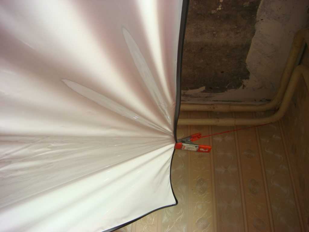 Приступая к данному этапу, следует закрыть все окна и двери в помещении. Наличие сквозняка недопустимо. Пленку аккуратно распаковывают и подвешивают на предварительно закрепленные по углам прищепки «крокодилы».