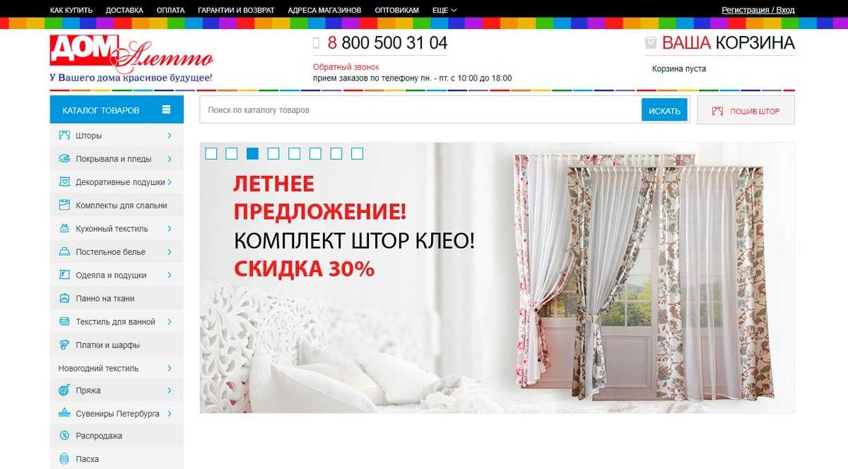 Интернет магазин Domaletto предлагает широкий выбор готовых недорогих штор. Для гостиной подойдет комплект штор с ламбрекеном из жаккардовой тафты, для комфортного отдыха в спальне — светонепроницаемые с фотопечатью, для беззаботной детской комнаты подойдёт легкое полотно из микровуали. Также на площадке представлен выбор уютного текстиля для дома.