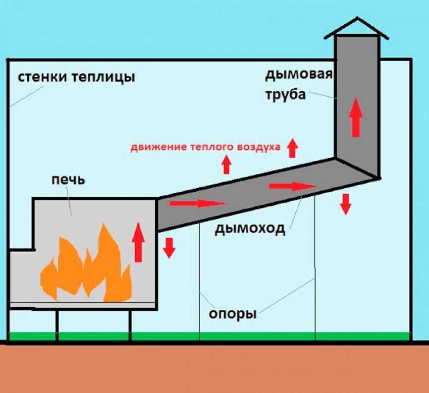 Важно! Задачей тепличной печи в первую очередь является прогрев почвы, поэтому дымовой канал и само устройство располагаются по возможности ближе к земле