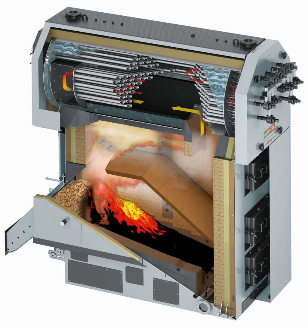 В агрегате область горения смещена к зоне колосников. Газы выходят сквозь соседнее отделение, где догорают и выделяют тепло. Лучшим материалом служит кирпич.