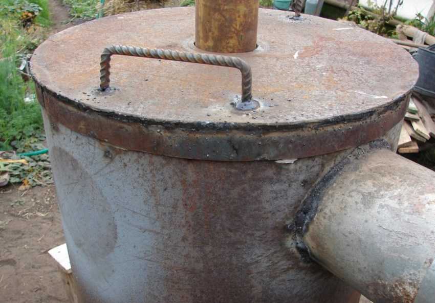 - Приварить отрезанную крышку, посередине которой сделать 10-сантиметровое отверстие под трубу.