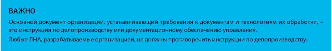 Наряду с инструкцией по делопроизводству в организациях могут разрабатывать и иные нормативные документы по делопроизводству: правила, положения, регламенты, порядки, которые регулируют работу с отдельными видами или комплексами документов (например, положение о внутренних нормативных документах организации, положение о ведении договорной работы и т.д.). Также разрабатывают ЛНА, которые регламентируют административные или бизнес-процессы (например, регламент контроля исполнения документов (поручений)). Кроме этого, работа в системе электронного документооборота (далее – СЭД) происходит в соответствии с инструкциями, которые разрабатывают поставщики программного обеспечения.
