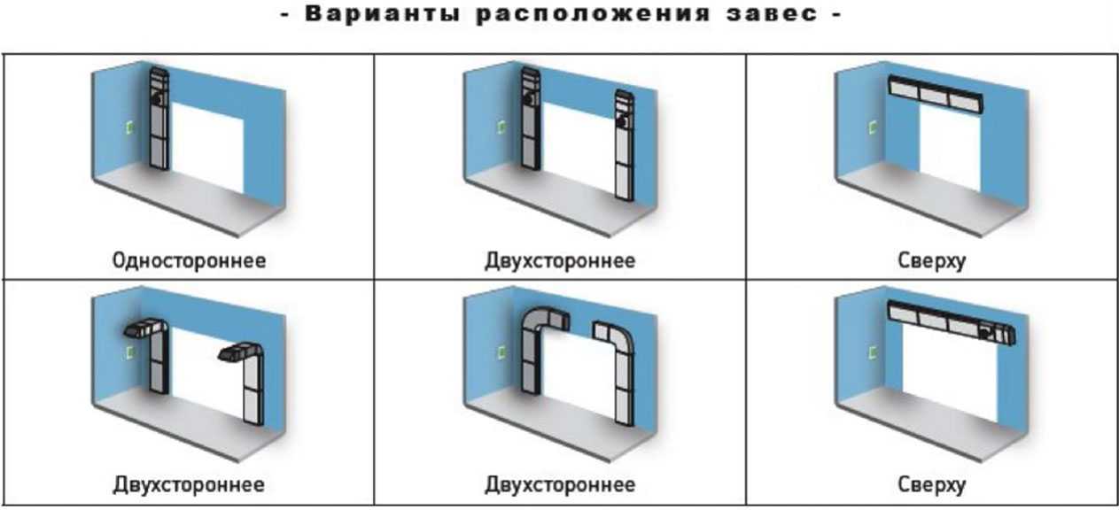 Вид установки тепловой завесы определяется типом модели и особенностями помещения. До начала монтажных работ следует ознакомиться с инструкцией производителя и другой сопроводительной документацией.