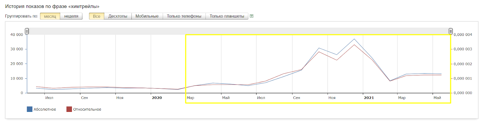 Это история запросов в Яндексе по слову «химтрейлы». На графике видно, что с началом коронавирусной пандемии количество запросов стало расти