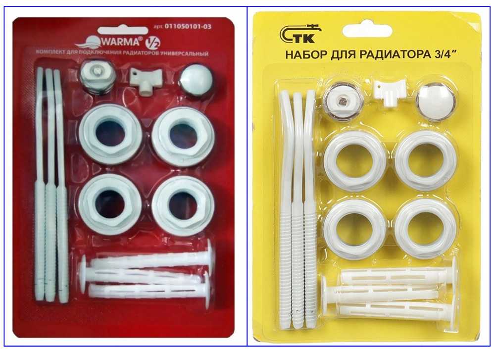 Для подключения к ним арматуры стандартными диаметрами 1/2 или 3/4 дюйма в торговой сети реализуют комплекты с четырьмя переходными футорками (узкие муфты с разными резьбами) на диаметры 1 — 1/2 или 1 — 3/4 дюйма. В стандартный комплект также входят кран Маевского с ключом и заглушка.