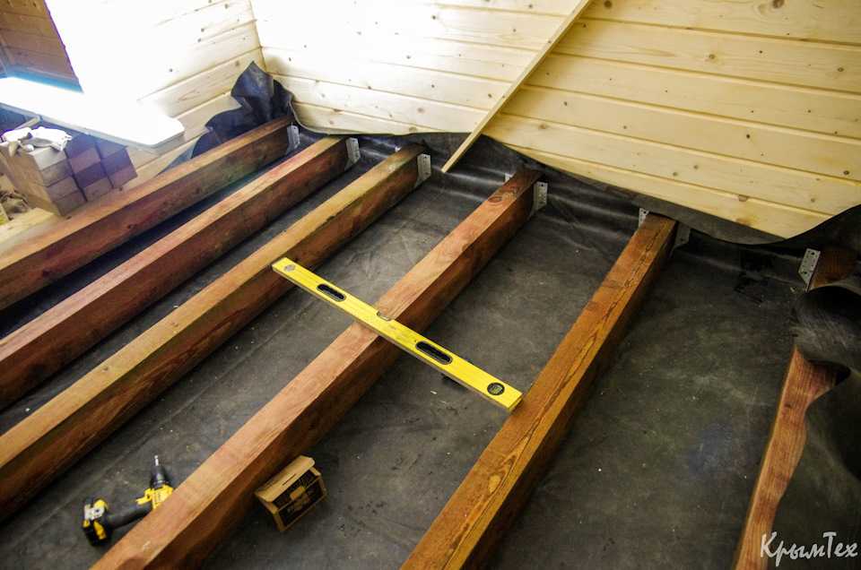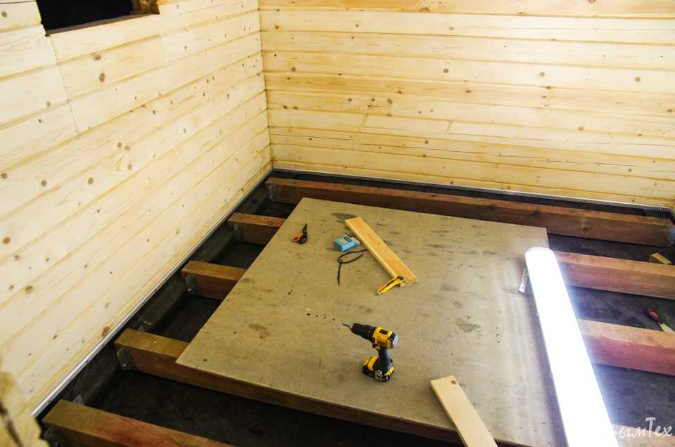 Для того что бы не уменьшить высоту потолка, черной пол из доски 25х100 подшил прям к низу обвязочного бруса, дополнительно снизу еще подшил к обвязке лаги 50х100 через 60 см. В итоге черной пол не “съел” ни миллиметра высоты, а так же по нему можно свободно ходить.
