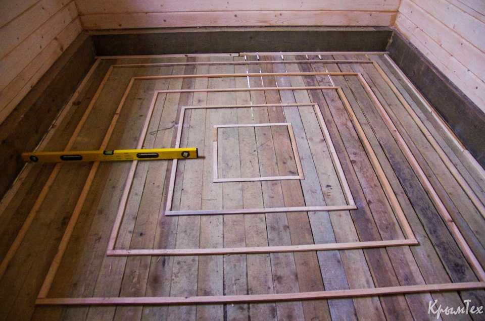 Далее нам нужно задать уклон, для этого нарезал реек толщиной от 2 см до 5 мм, толщину каждого ряда просчитали согласно имеющихся размеров и нужного уклона. Получаем уклон в 2 см на 1,4 метра.