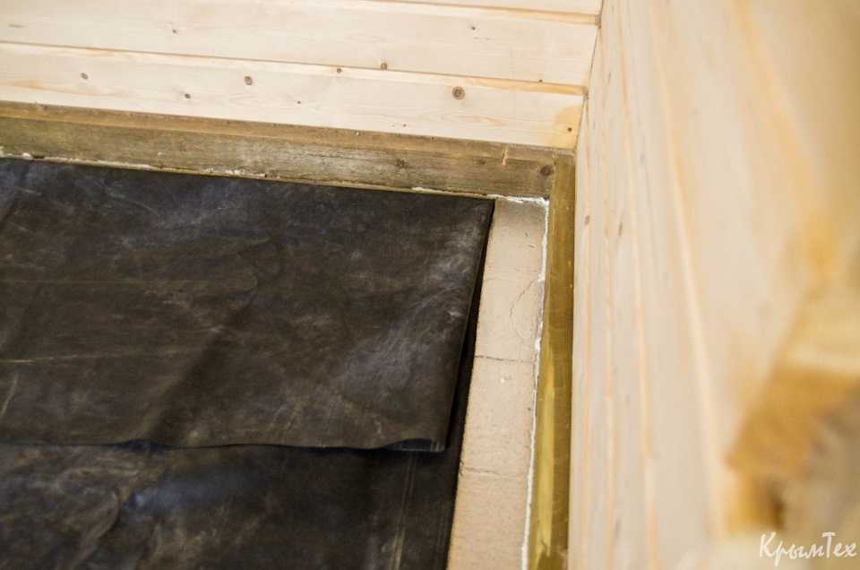Тут надо сделать отступление. Поскольку весь пирог пола от чернового пола до чистового у меня составил аж 30 см и это без высоты самого чернового пола, он еще дополнительно 12 см, то это очень сильно поднимало уровень пола в парной и сильно уменьшало высоту потолка. Отсюда и такие манипуляции с черновым полом и сложным обходом обвязки мембраной. А если это предусмотреть заранее и поднять высоту бани дополнительно еще на пару венцов, то в итоге получим более простой монтаж, но при этом это увеличит общую высоту здания и высоту нулевого пола, что то же может не очень хорошо.