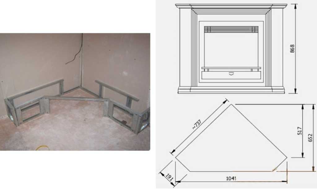 На пол установите специальный подиум для имитационного камина и металлический каркас, основа которого должна быть достаточно надежной, чтобы выдержать ту нагрузку, которую ей даст электрический камин. По этой причине профили в основе прикрепляйте через каждые 200 миллиметров.