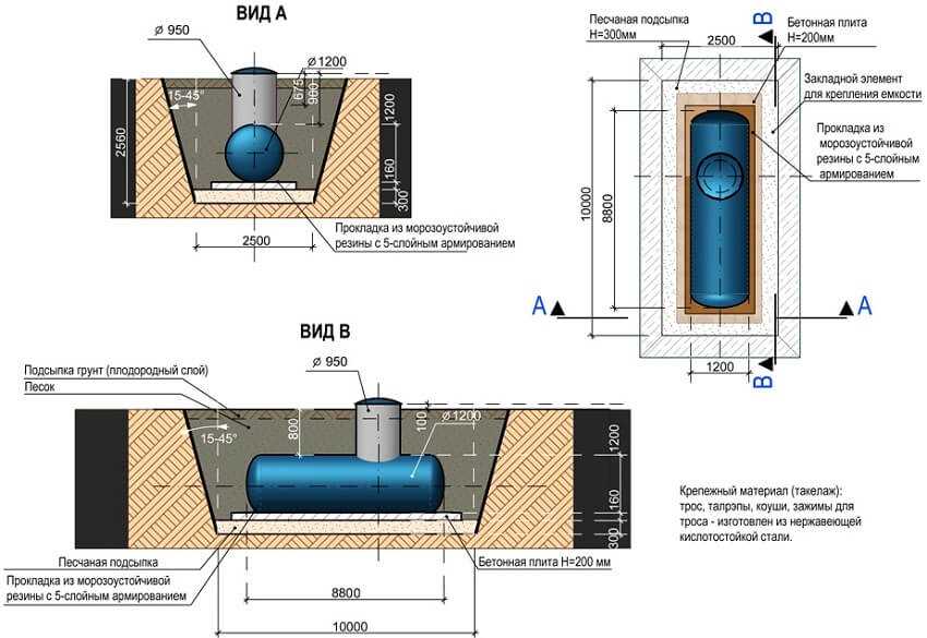 - Лапы корпуса фиксируют к анкерам на фундаменте. Если конструкция не предусматривает наличие лап, ее фиксируют к анкерам металлическими тросами в виде петель. Такая фиксация избавит баллон от перекоса или выдавливания из приямка во время поднятия грунтовых вод.
