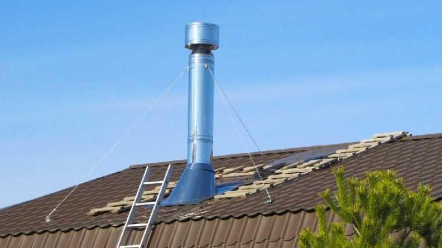 Труба протягивается через короб с выходом на крышу, при этом по всей ее длине производится утепление базальтовой ватой, которая покрывается фольгой и крепится стальной проволокой. Теплобарьер является негорючим, поэтому, кроме своего прямого назначения, не позволяет воспламениться конструктивным элементам крыши – температура газов составляет 200÷600 ºС