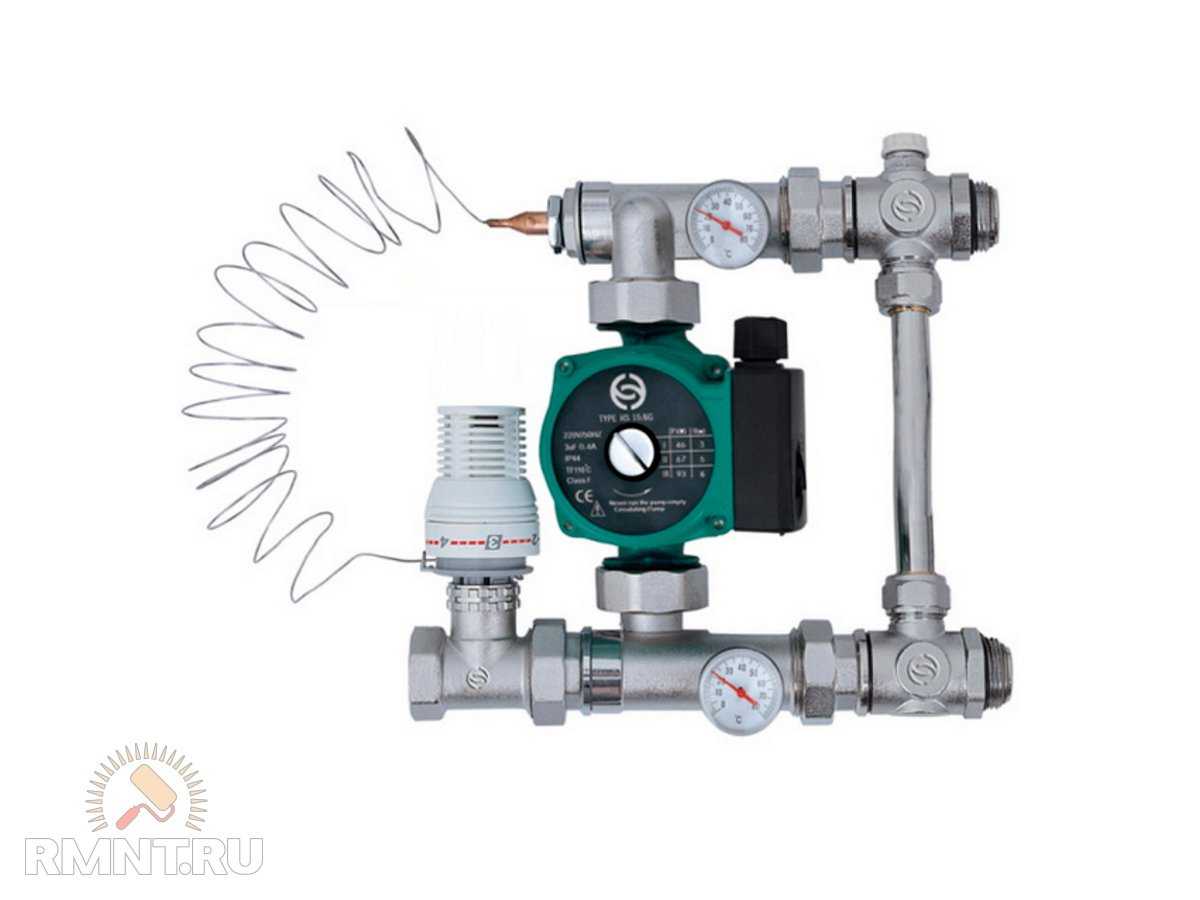 Смесительная группа для теплого пола может строиться на основе двухходового и трехходового клапана. Если система отопления смешанная — с радиаторами и теплыми полами, то в узле присутствует еще и циркуляционный насос. Даже если в котле имеется свой циркуляционник, все петли теплого пола «продавить» он не сможет. Потому и ставят второй. А тот, который на котле, работает на радиаторы. В таком случае эту группу иногда называют насосно-смесительным узлом.