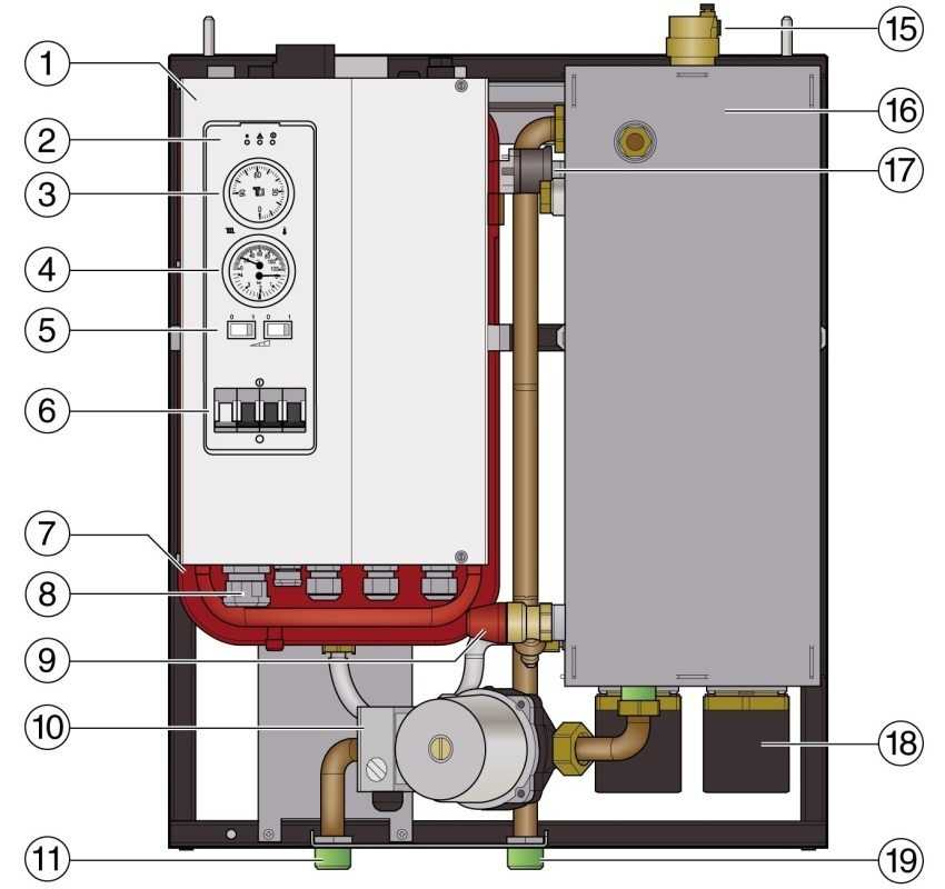 Схема строения одноконтурного настенного электрического котла: 1 — электрошкаф; 2 — контрольные лампы; 3 — регулятор температуры; 4 — термометр/манометр; 5 — выключатели мощности; 6 — главный выключатель; 7 — расширительный бак; 8 — кабельный ввод; 9 — предохранительный клапан; 10 — насос; 11 — обратная линия котла; 12 — штекерное соединение контура регулирования; 13 — предохранительный ограничитель температуры; 14 — предохранитель системы управления; 15 — воздушный клапан; 16 — облицовка котла с теплоизоляцией; 17 — реле давления воды; 18 — нагревательные стержни; 19 — подающая линия котла