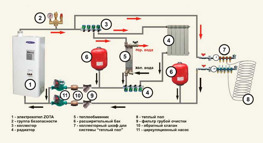 Также схема отопления от электрокотла включает элементы, предназначенные для подсоединения настенных приборов к отопительной конструкции, которая может предназначаться для стандартного обогрева помещений, для горячего водоснабжения или для системы теплый пол (детальнее: «Какой электрокотел для теплого пола лучше выбрать»).
