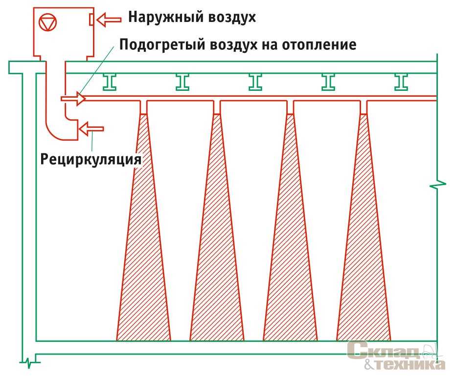 В централизованных системах воздушного отопления применяют воздушно-отопительные агрегаты, распределяющие по системе воздуховодов теплый воздух в помещения. Для складских помещений предусматривается размещение отопительных агрегатов вне отапливаемых помещений. Воздух подается через воздухораспределители, которые должны обеспечивать равномерное движение обратного потока через помещение. Места выпуска воздуха следует назначать так, чтобы на пути воздушного потока не встречались массивные строительные конструкции.