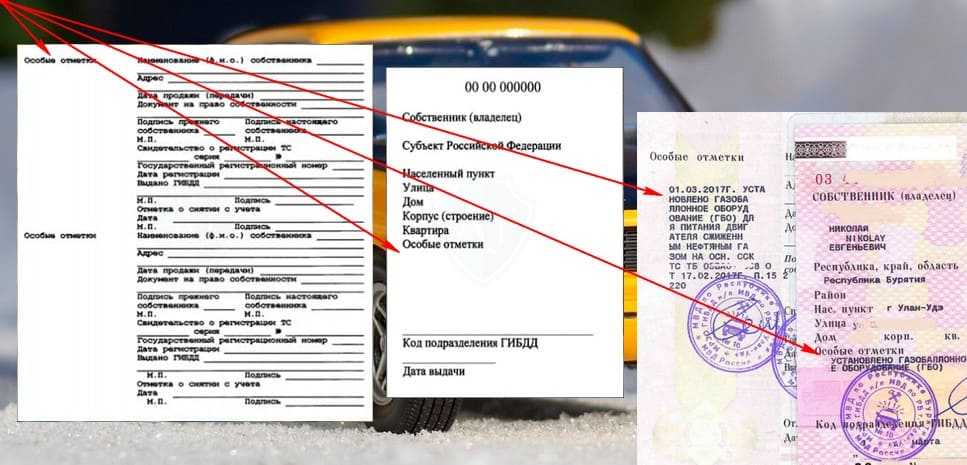 Особые отметки в бланке ПТС (слева), бланке СТС (посередине) и как выглядит реальное фото пометок о ГБО