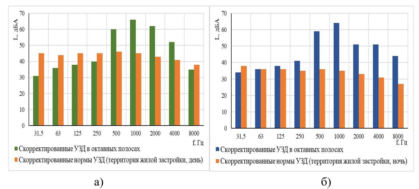 Рис. 4. Октавные спектры шума в точке 6: а — дневные измерения УЗД; б — ночные измерения УЗД