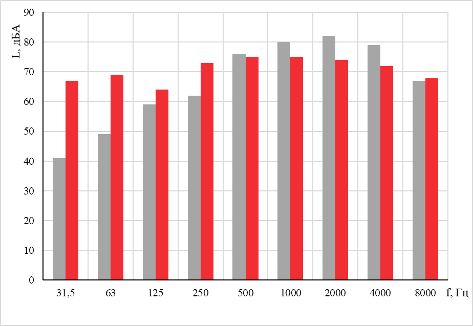 Рис. 3. Скорректированный октавный спектр шума (серый цвет) в зоне ГРП и скорректированный предельный спектр (красный цвет)