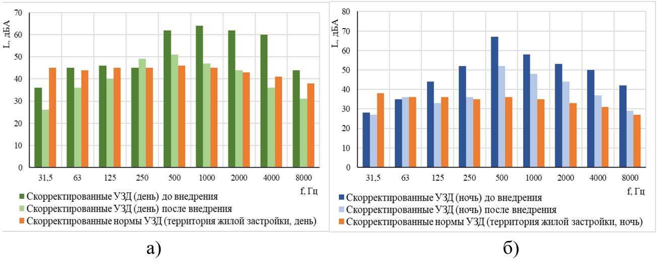 Рис. 7. Октавные спектры шума в точке 6 до и после внедрения шумозащитных мероприятий: а — дневные измерения УЗД; б — ночные измерения УЗД