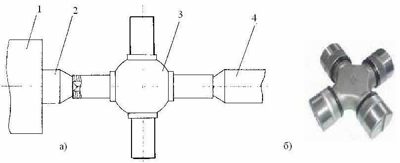 Рис. 2. Восстанавливаемая крестовина карданного вала: а – схема закрепления для наплавки; б – внешний вид крестовины после восстановления; 1 – зажимной патрон; 2 – центр; 3 – крестовина; 4 – задняя бабка станка