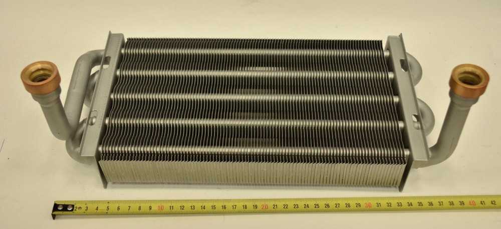 Эти медные элементы функционируют по принципу «труба в трубе». Они призваны подогревать теплоноситель для системы отопления и ГВС. Эффективно нагревают воду, но обязательно требуют, чтобы теплоноситель был высокого качества. Если жидкость подается со множеством примесей, тогда тонкие трубы быстро засоряются, в результате эффективность работы котла снижается.