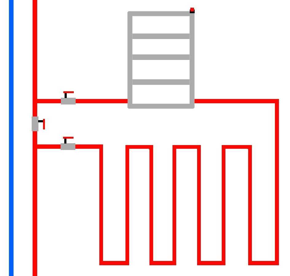 Точкой стыка становится разрез стояка, при таком сценарии оба отопительных прибора будут функционировать одновременно. Стояк отключают, из него вырезают участок трубопровода, в срез внедряют шаровой кран и вентиль (либо 2 вентиля), через них присоединяют трубопровод контура.