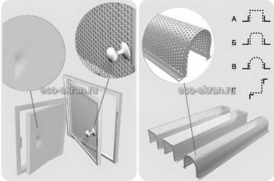 Декоративные короба для труб отопления делаются из перфорированного металла различной перфорации и цвета. При необходимости в них делаются вырезы под трубы или лючки для доступа к вентилям. Короба для труб бывают следующих видов: