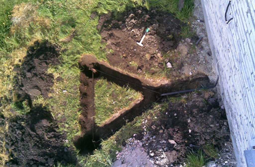 При помощи лопаты необходимо выкопать траншеи в форме треугольника и подвод к нему глубиной 0,5-0,7 м. Примерная длина сторон треугольника – 1,2 м: