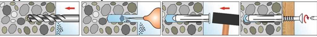 - Просверлить отверстия нужного диаметра (обычно Ø 10 мм), вставить дюбели в отверстия.