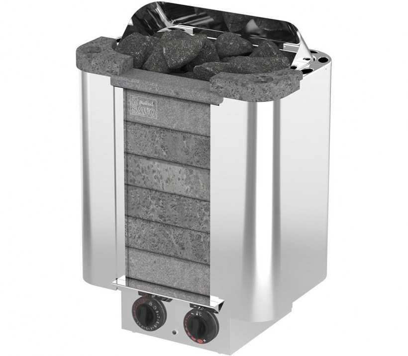 Электрическая печь для сауны состоит из металлического корпуса с теплоизоляционным материалом, нагревательных элементов и клети для камней. Такие печки делятся еще и по материалу изготовления корпуса.