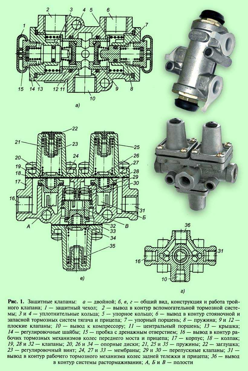 Двойной защитный клапан (рис. 1, а) служит для распределения поступающего из компрессора сжатого воздуха по двум контурам и поддержания давления в одном контуре при повреждении другого. Сжатый воздух из компрессора, пройдя регулятор давления и предохранитель от замерзания, поступает в центральную полость и, отжав два плоских клапана, через вывод проходит в контур вспомогательной тормозной системы, и одновременно, через другой вывод – в контур стояночной и запасной систем тягача и прицепа.
