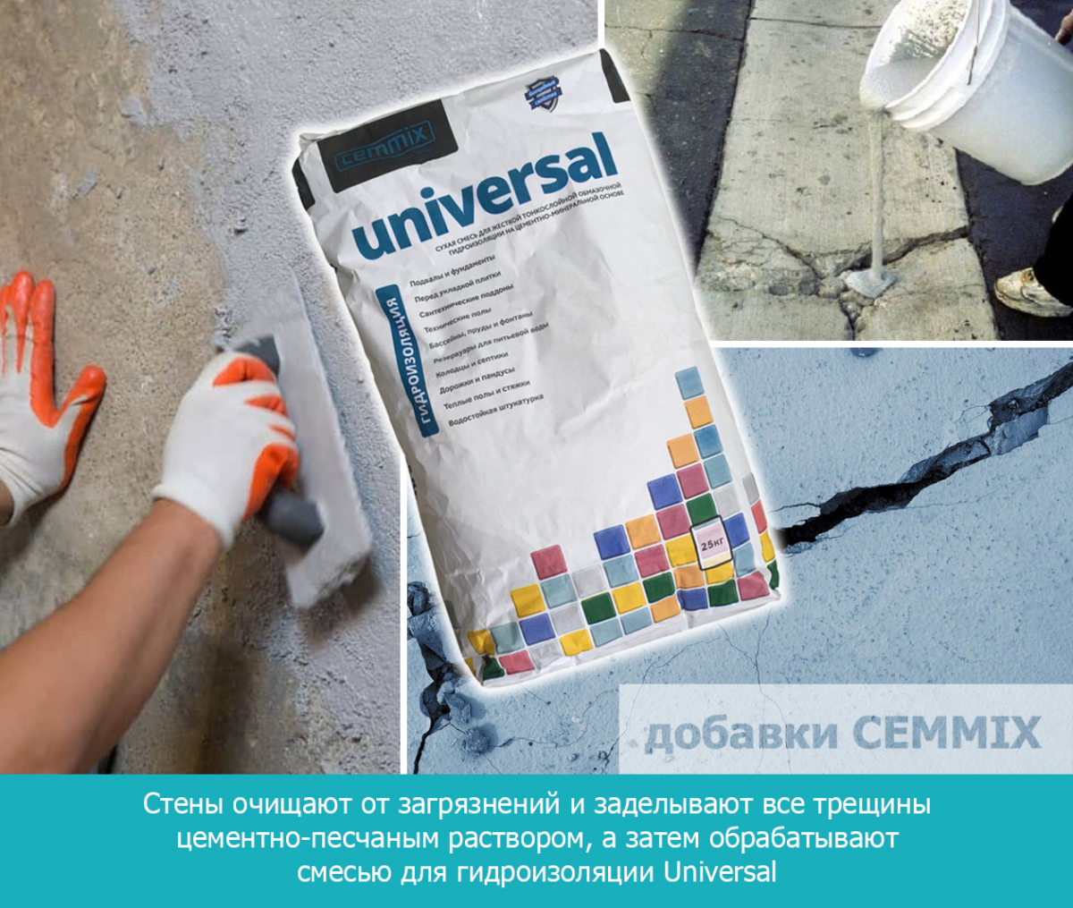 Стены очищают от загрязнений и заделывают все трещины цементно-песчаным раствором, а затем обрабатывают смесью для гидроизоляцииUniversalили специальнымигидрофобизирующими пропитками.