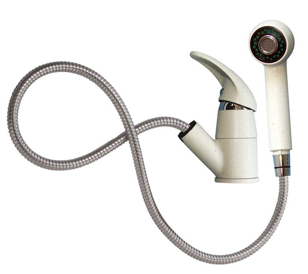 Кухонный кран рекомендуется приобретать одновременно с мойкой и у одного производителя, так шансов попадания в один тон будет больше. В отличие от раковины он изготавливается из металла, а сверху только покрывается составами, повторяющими окраску мойки.